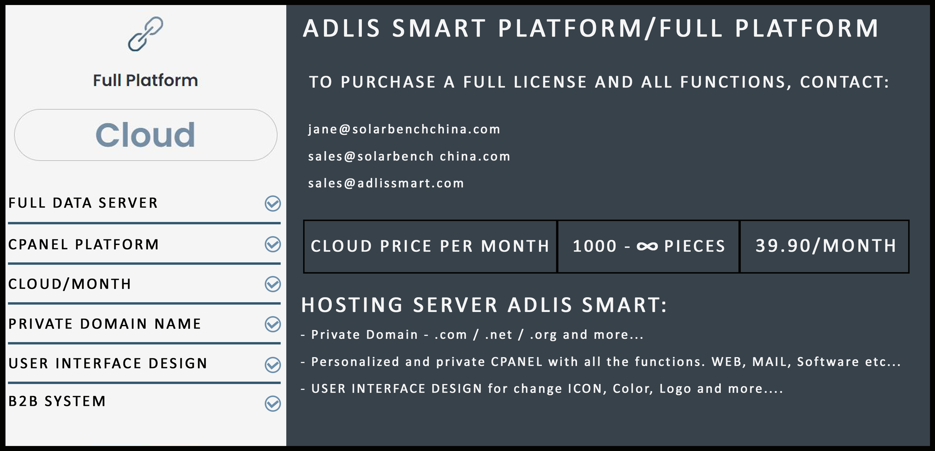 - Dominio inteligente de Adlis con el nombre de la empresa (adlissmart.com/CompanyName). - Adlis Smart CPANEL con todas las funciones para configurar y operar la plataforma. - Vincula el dominio inteligente de Adlis con inicio de sesión privado para abrir la plataforma.