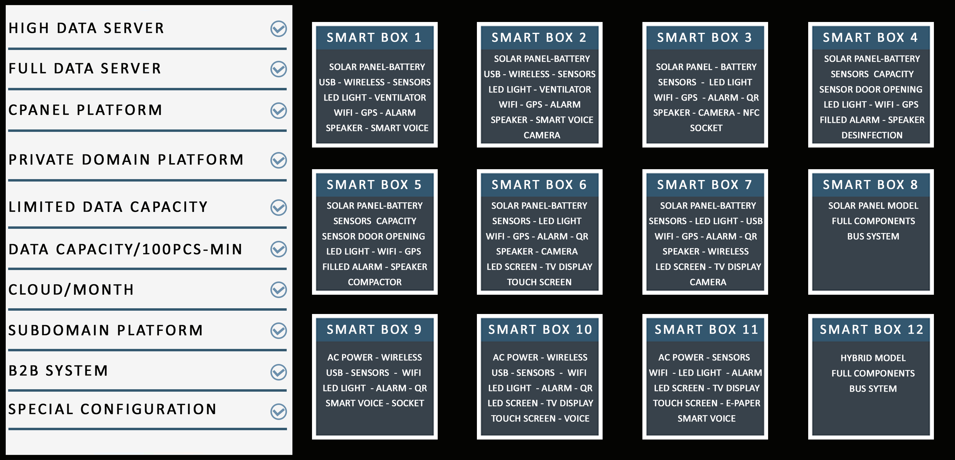 Cada uno de nuestros productos se puede configurar con diferentes opciones. Con nuestro Hardware / Software combinado con el nuestro, Adlis SmartBox nos permite todas las opciones posibles para Total Smart City.